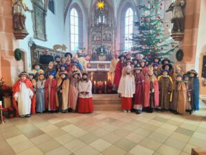 Für die „Lausbuben Gottes“, für Eltern und Gläubige eine besondere feierliche Zeremonie, bei der Stadtpfarrer Johannes Bosco die zehn neuen Buben und Mädchen auf einen Kernpunkt ihres künftigen Wirkens einschwor: „Ihr dient in erster Linie nicht dem Pfarrer, sondern zur Ehre Gottes und zur Freude der Menschen“. Die Fürbitten handelten vom Wunsch für die „Minis“, Freude in der Gemeinschaft zu erfahren. Zur feierlichen Aufnahme gehörten die Überreichung der Ministranten-Plaketten und der Ausweise durch den Ortspfarrer. Es assistierten Pastoralreferent Alfred Kick und die Gruppenleiterinnen Anna Kastl und Rebecca Schultes.